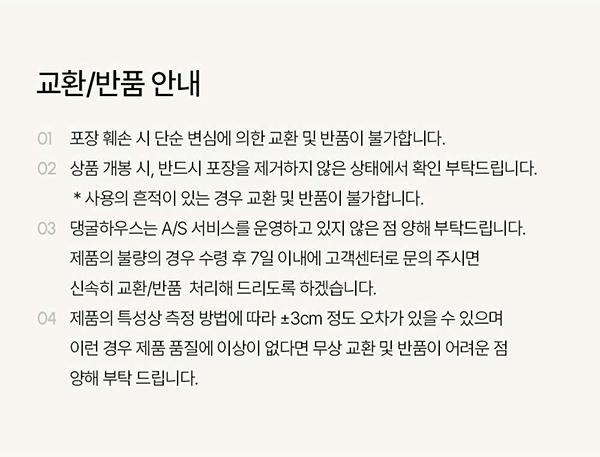 ※ 단순변심으로 인해 교환, 반품을 원하실 경우 상품반송 비용은 고객님께서 부담하셔야 합니다.